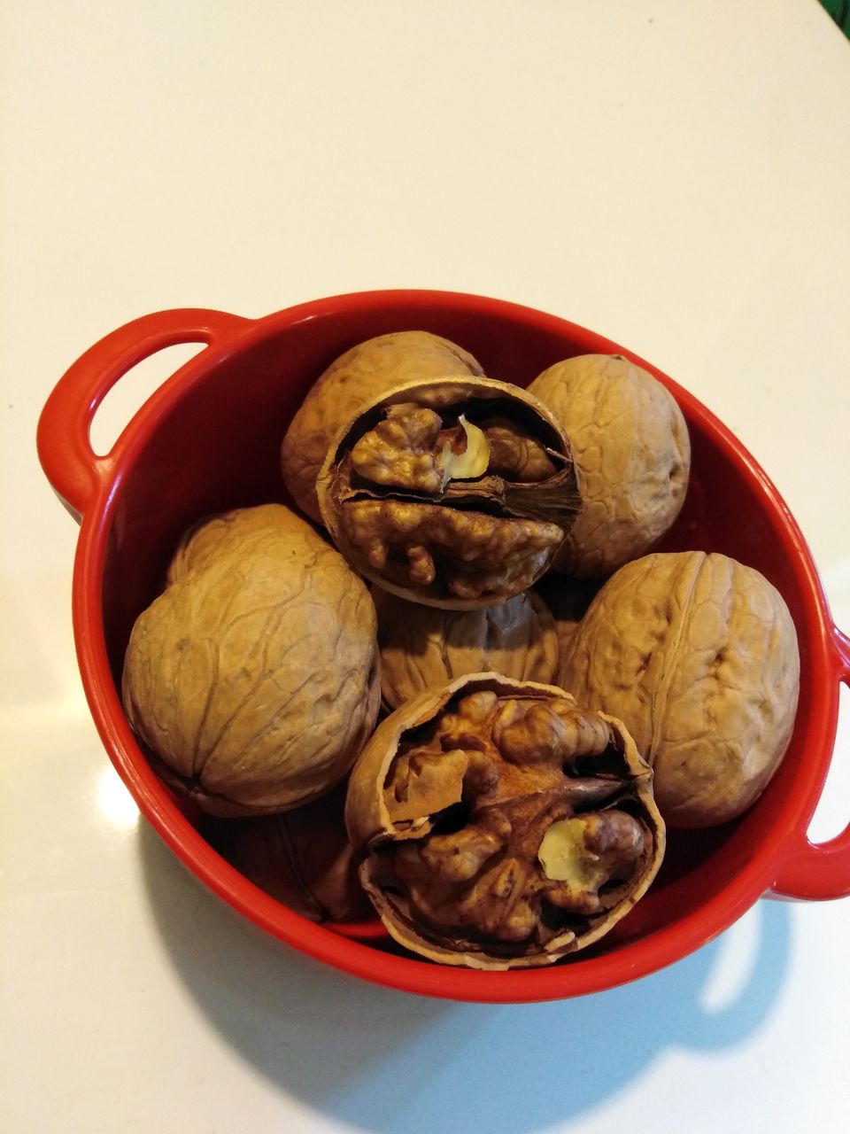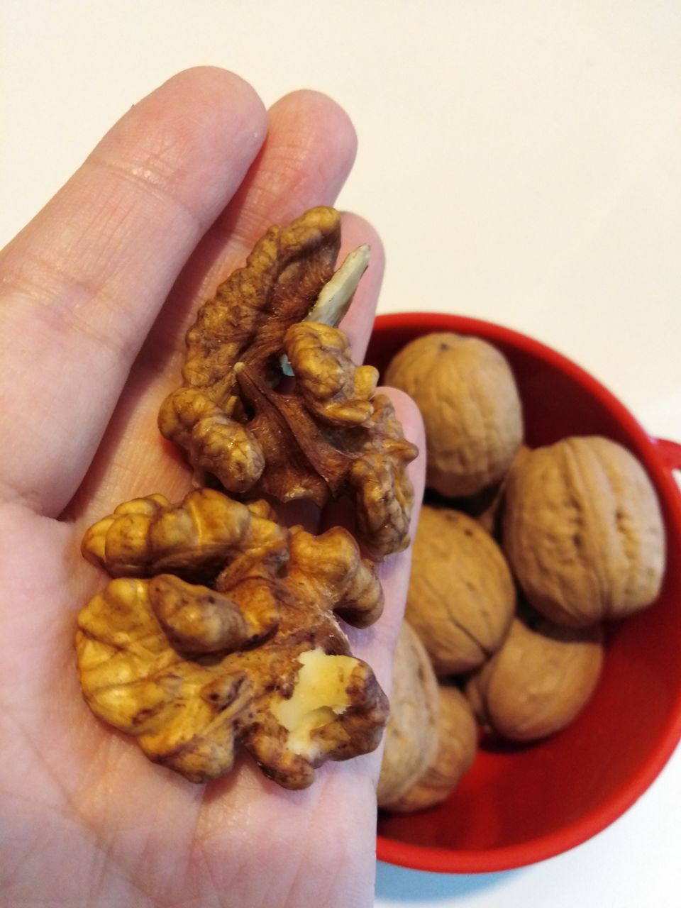 くるみのほうは、手で割って開けることができます。腕力のない人は、へらか何かで押しつぶすと簡単に殻が破れます。